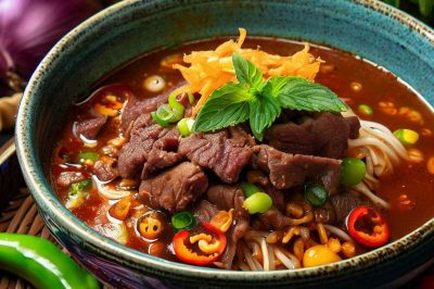 Enjoy an authentic bowl of Vietnamese Bun Bo Hue Bo (Beef Spicy Noodle Soup). This traditional soup is made with beef, noodles, and a spicy broth that will tantalize your taste buds! It takes 10 minutes to prepare and 30 minutes to cook for one serving of this delicious soup!
