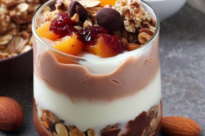 This delicious and nutritious yogurt dish is the perfect way to start your day. It’s made with creamy yogurt, sweet fruit compote, crunchy mixed nuts, and decadent milk chocolate for a truly indulgent breakfast.