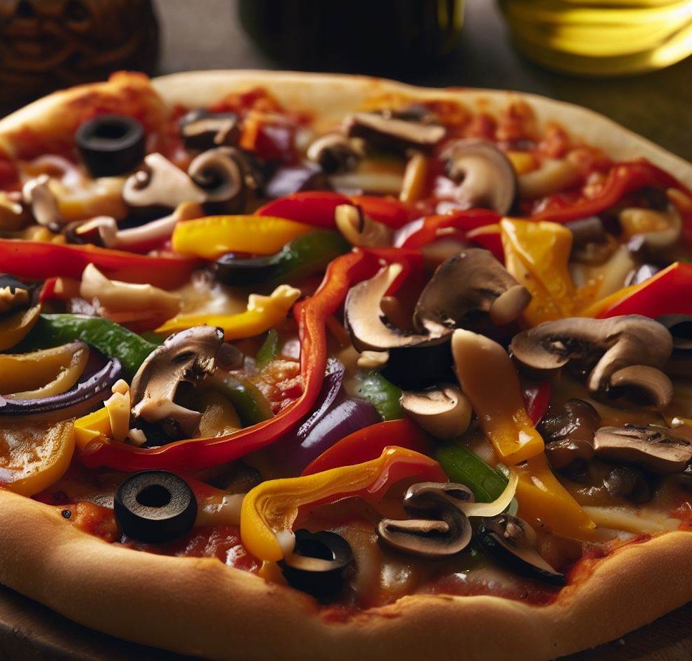 One Serving Veggie Pizza with Bell Peppers, Onions, Olives, and Mushrooms
